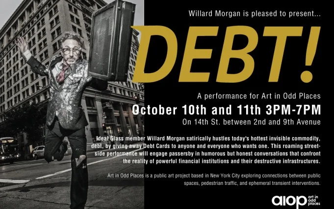 Ideal Glass member Willard Morgan satirically hustles today’s hottest invisible commodity, debt, by giving away Debt Cards to anyone and everyone who wants one. This roaming street- side performance will engage passersby in humorous but honest conversations that confront the reality of powerful financial institutions and their destructive infrastructures.