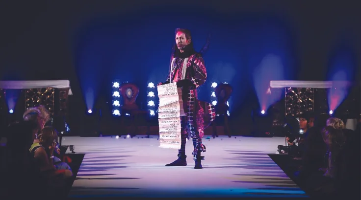 Intertwining art, experimental fashion and mythological narrative into a seven act performance and related videos, The Purple Jester subverts the archetype of the Jester by re-casting him as the hero, transcending conflict through the strategic implementation of humorous acts.